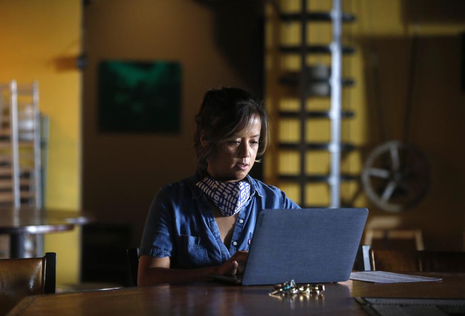SAN FRANCISCO, CA – APRIL 28: Deanna Sison takes a break from preparing preordered lunches to check … [+]