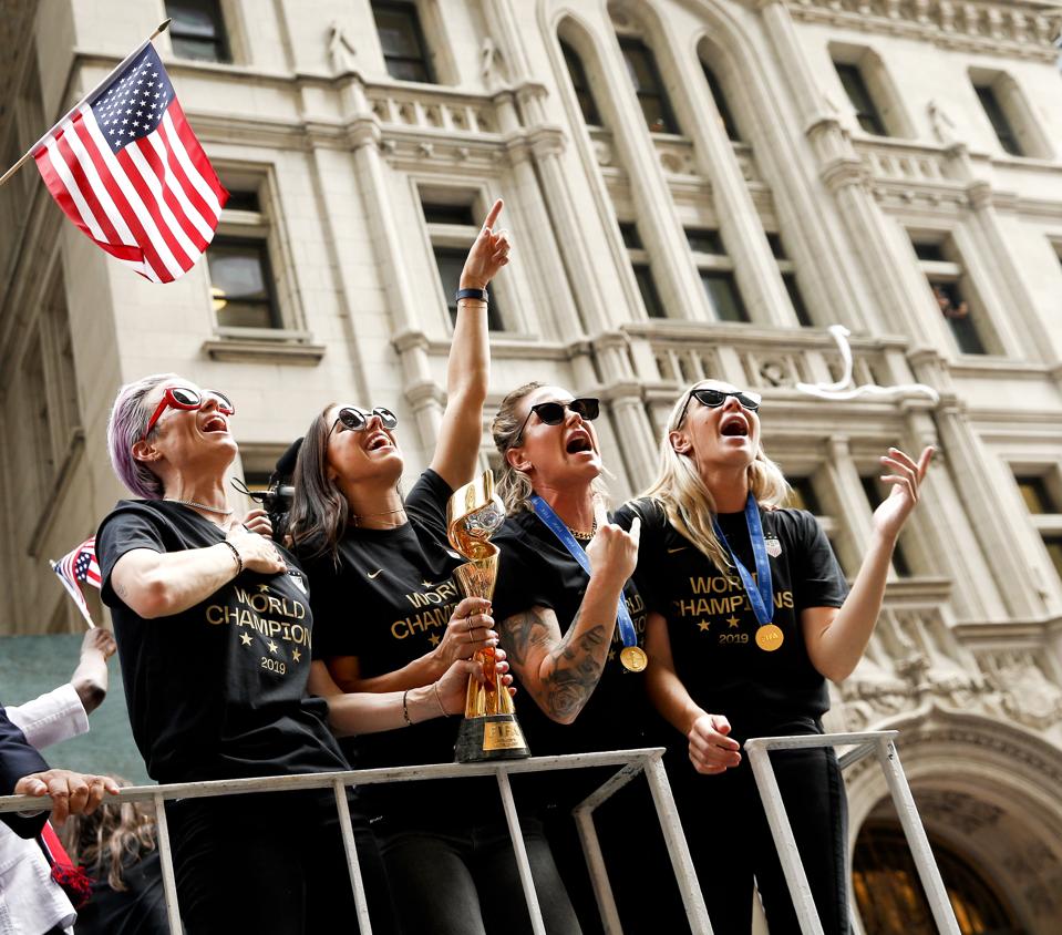 The official celebration took place Wednesday, with a ticker-tape parade in lower Manhattan and a presentation at New York’s City Hall. Here team members Megan Rapinoe, Alex Morgan, Ashlyn Harris and Allie Long enjoy the crowd.