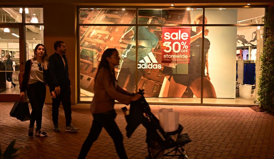 Shoppers at an outlet mall exit an Adidas store on May 21, 2019 in Los Angeles. Photo credit: FREDERIC J. BROWN/AFP/Getty Images