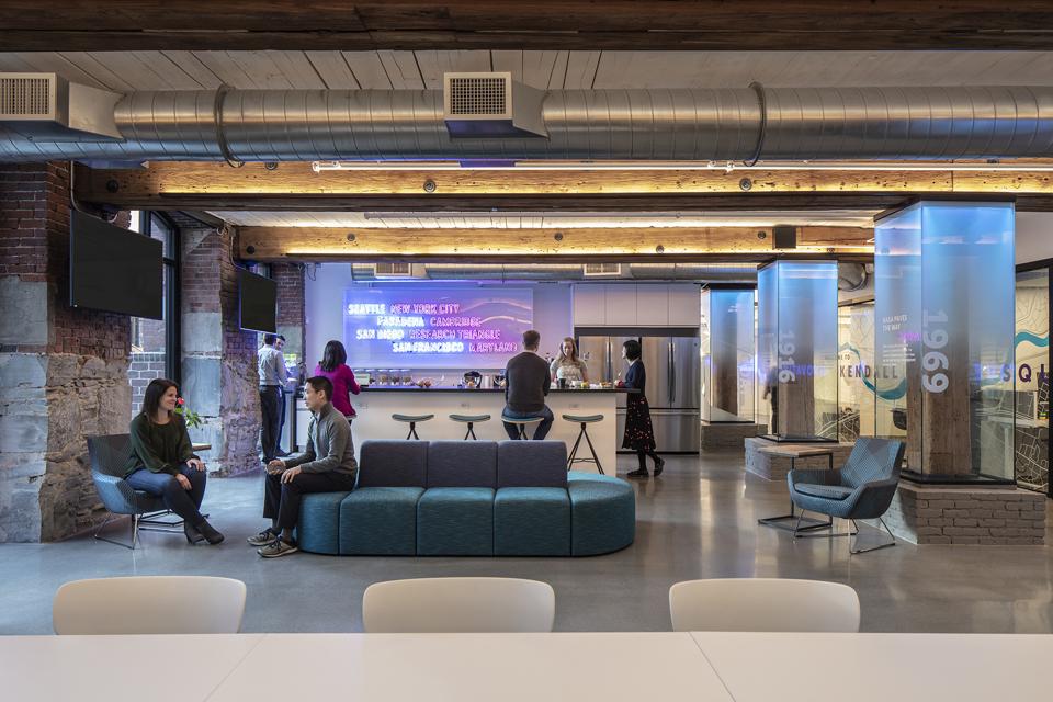 The lounge and kitchen area at Alexandria LaunchLabs at the Alexandria Center, One Kendall Square, in Cambridge, Mass.
