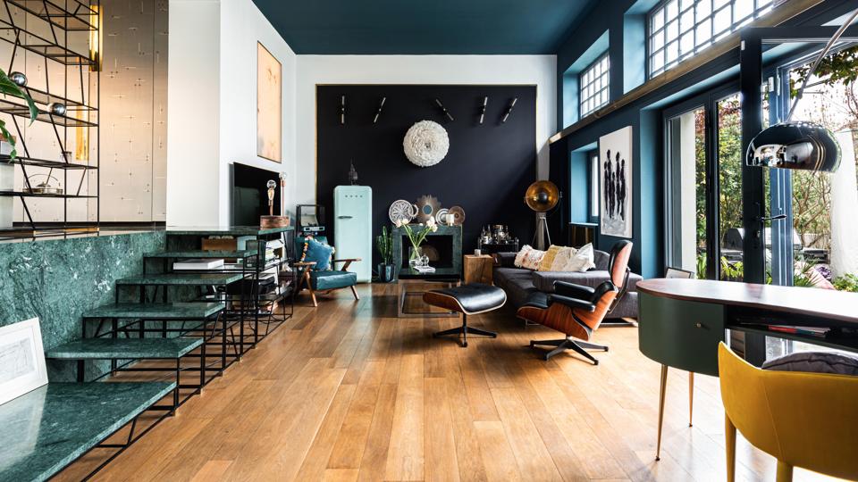 Brass and glass accents mix with rich, jewel tones throughout, which give it a glamorous art deco vibe. Geometric lines in the abundance of metal metalwork echo the original style of the building. The living room has teal walls, a concertina glass and brass screen and a brass radiator, while the floor in the raised dining room is laid with emerald coloured stone tiles.