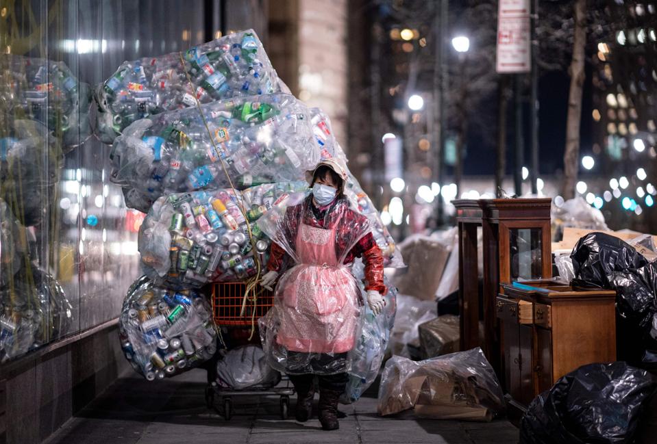 TOPSHOT – A woman wearing a face mask and a plastic bag pulls a cart loaded with bags of recyclables … [+]