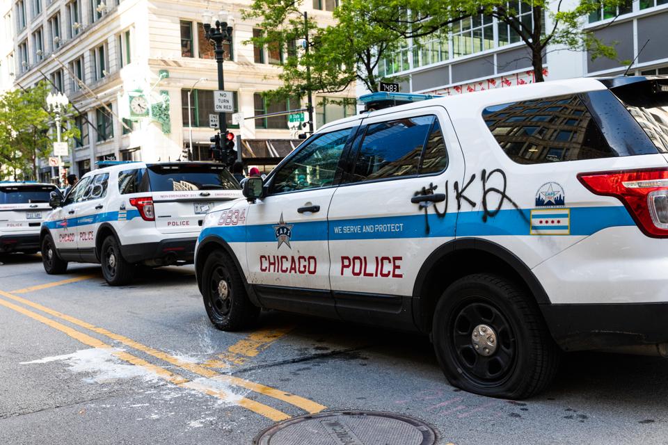 CHICAGO, ILLINOIS – MAY 30: Chicago Police Department vehicles are seen vandalized during a … [+]