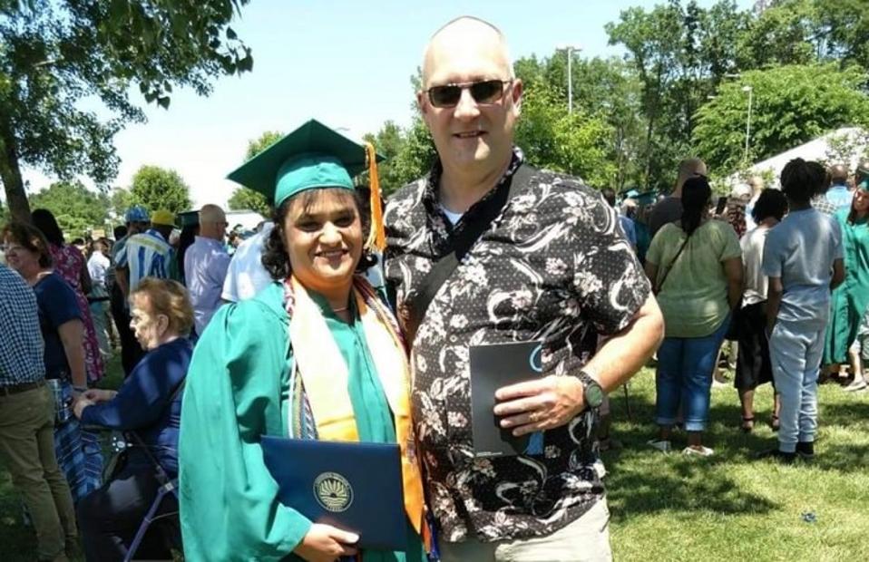 Allison Clemens-Roberts with her husband at Goodwin University graduation in 2019