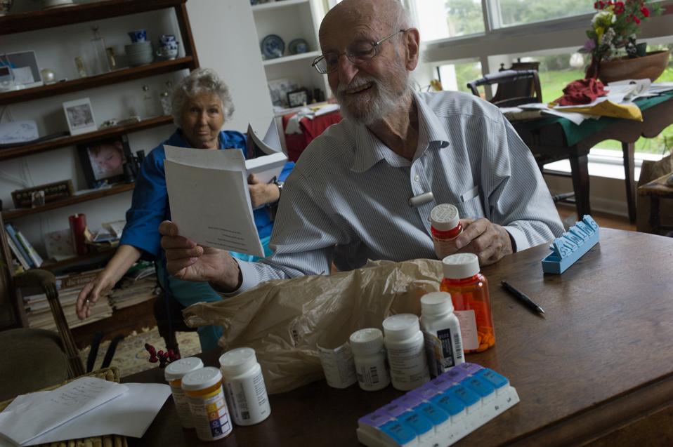 SARASOTA, FLORIDA – JANUARY 04: Charles Miller, 90, prepares the daily pills his wife will need for … [+]