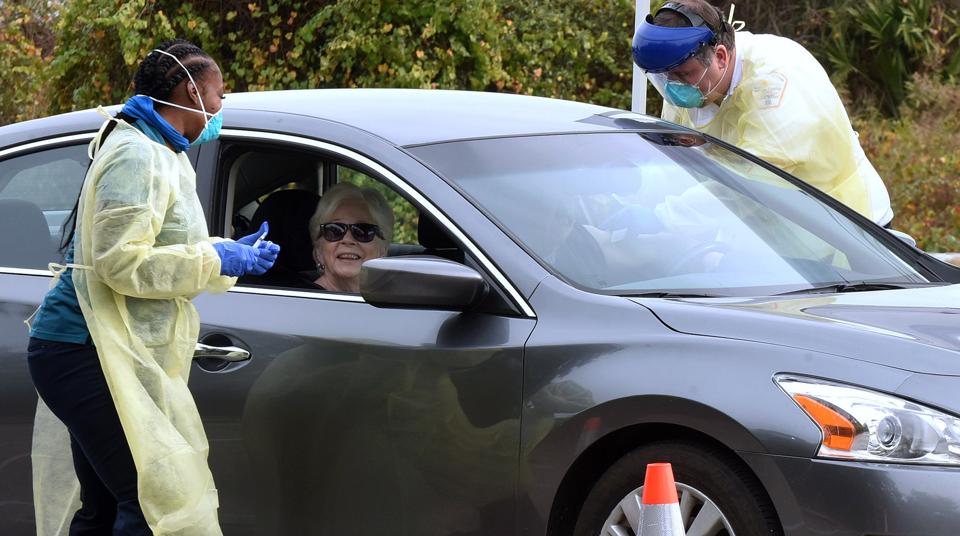 Health workers administer the Moderna COVID-19 vaccine to a couple in a car at a drive-thru … [+]