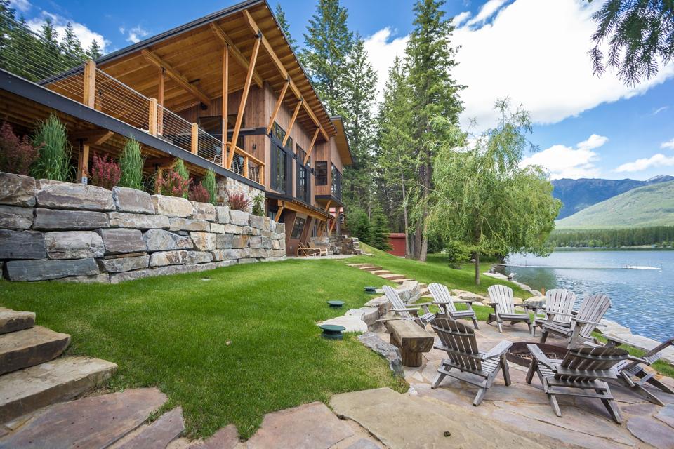 The Eureka, Montana, residence features a large outdoor deck and a lakeside fire pit.