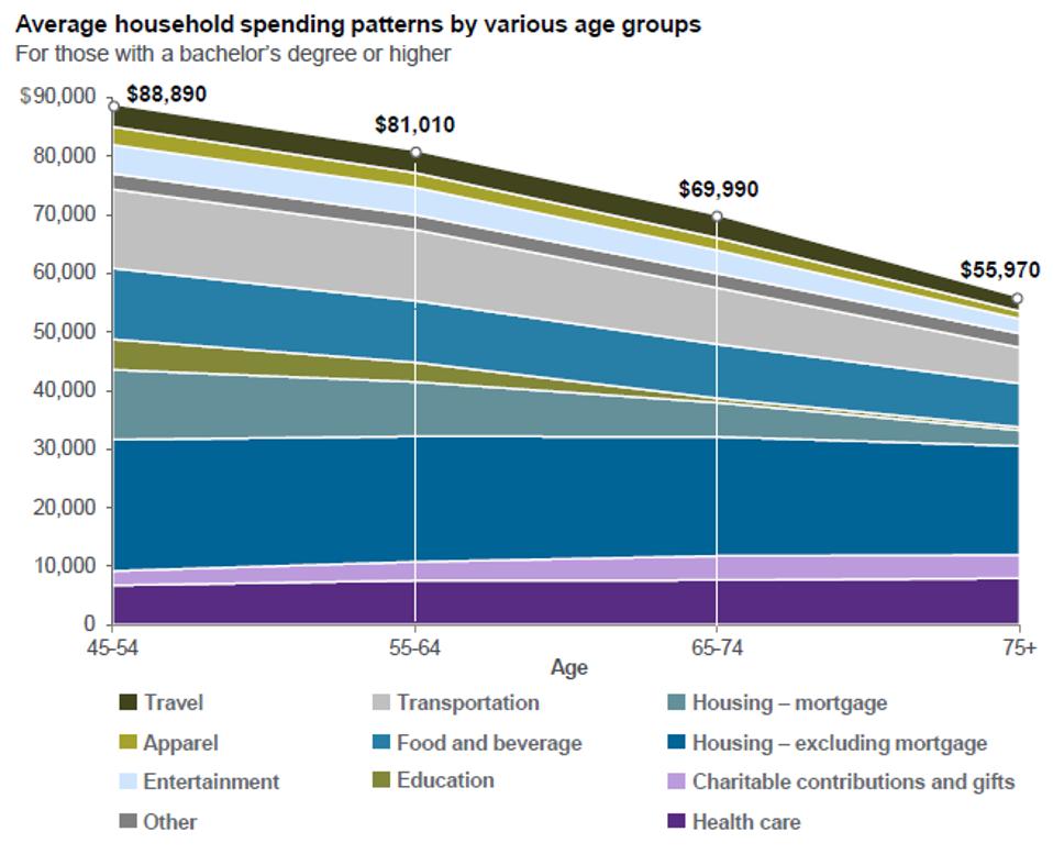 It’s also a misconception that expenses only go up in retirement. Spending usually peaks around age 50 and declines over time. While expenses like housing and healthcare remain significant during life, virtually all other spending categories tend to slowly decline.
