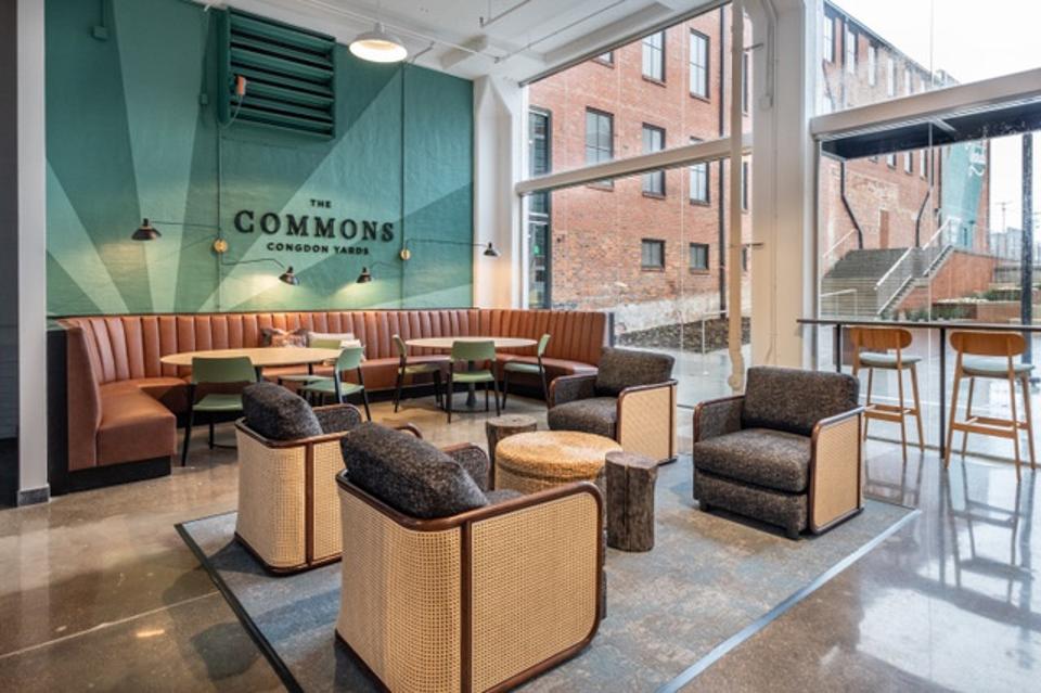 The Congdon Yards complex includes a collection of sophisticated woodworking machinery for training employees of the industry and also available for rent by designers, a floor of office space, the headquarters of a fabric company, meeting space, coffee shops and gathering spaces.